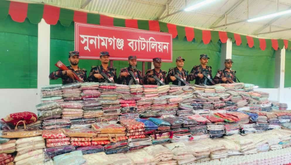 সুনামগঞ্জের সদর উপজেলার মইনপুর এলাকায় টাস্কফোর্সের অভিযানে ভারত থেকে অবৈধ পথে নিয়ে আসা বিপুল পরিমাণ শাড়ি জব্দ করেছে বিজিবি। যার আনুমানিক মূল্য ১ কোটি ৫৭ লাখ ৫৯ হাজার টাকা বলে জানিয়েছেন বিজিবি।